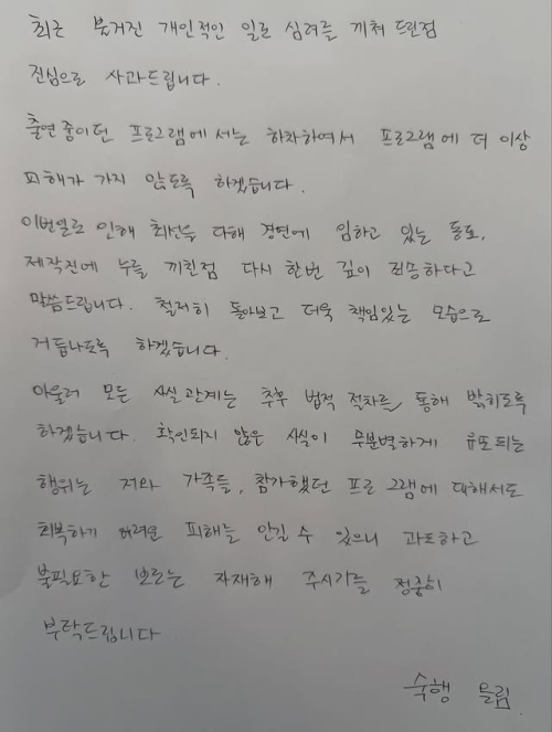 이어 "출연 중이던 프로그램에서 하차해 더 이상 피해가 가지 않도록 하겠다"면서 "이번 일로 인해 최선을 다해 경연에 임하고 있는 동료, 제작진에 누를 끼친 점 다시 한 번 깊이 죄송하다고 말씀드린다"고 재차 사과했다.