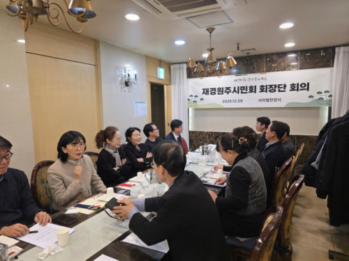 재경원주시민회는 지난 29일 오후 서울 한 음식점에서 한홍우 회장과 이규헌 차기 회장, 각급 재경동문회장, 사무총장 등이 참석한 가운데 2025 재경원주시민회 회장단 회의를 개최했다. 참석 동문회에는 재경원주고동문회와 재경원여고동문회, 재경대성중·고동문회, 재경상지여중·고동문회, 재경육민관고동문회, 재경영서고동문회 등이다. 또 재경원주시민회 산하 단체인 치악전우회와 원주고경제인연합회 회장단도 이날 회의에 함께 했다.