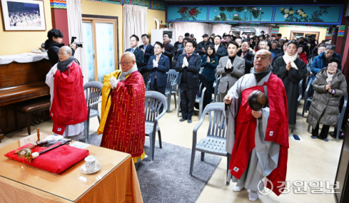 새해맞이 신년하례 범종타종법회가 1일 춘천 석왕사에서 편백운 주지스님, 김윤호 춘천사암연합 신도회장, 김진태 지사, 신경호 교육감, 육동한 시장, 허영 국회의원, 김진호 시의장을 비롯한 내빈과 불자들이 참석한 가운데 열렸다.