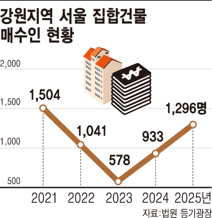 법원 등기광장에 따르면 지난해 도내에서 서울 집합건물(아파트·오피스텔·다세대주택 등)을 구입한 매수자는 전년대비 37.7% 증가한 1,296명이었다. 2년 전인 2023년(578명)보다 2배 넘게 급증했다.