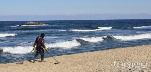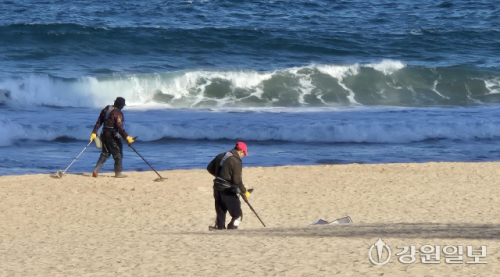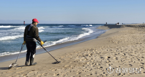 금값 고공행진이 이어지는 가운데 8일 강릉의 한 해변 백사장에서 주민이 금속 탐지기를 이용해 금붙이 등을 찾고 있다. 강릉=권태명기자