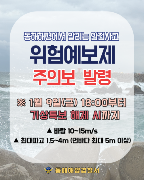 동해해양경찰서(서장:김환경)는 동해중부전해상 풍랑예비특보 발표에 따라 안전사고 위험예보제 ‘주의보’ 단계를 9일 오후 6시부터 기상특보 해제때까지 발령한다.