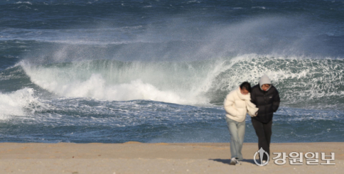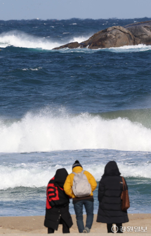 동해안에 순간풍속 70km/h(산지 90km/h)의 강한 바람과 강릉 앞바다에 최고 3.5m의 거센 파도가 일며 강풍·풍랑특보가 내려진 11일 강릉 경포해변을 찾은 관광객들이 추위와 바람에 잔뜩 움츠려 있다. 강릉=권태명기자