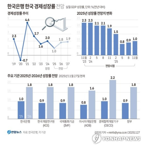 ■올해 성장률 전망치 1.8%, 작년의 약 2배…"연초 동결 속 경기 지켜볼 것"=한은의 올해 실질 국내총생산(GDP) 성장률 전망치(1.8%)가 1% 안팎으로 추정되는 작년 성장률의 약 두 배에 이르는 만큼, 연초부터 한은이 경기 부양을 명분으로 금리 인하를 단행할 가능성도 크지 않다.