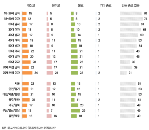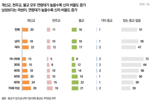 이번 조사에서 가장 눈에 띄는 점은 종교 인구의 가파른 고령화였다. 조사에 따르면 천주교 신자의 50%, 개신교 신자의 44%, 불교 신자의 43%가 60세 이상으로 나타났다. 종교인 10명 중 4~5명이 60세 이상인 셈이다. 반면 30대 이하 젊은 신자 비율은 개신교 21%, 천주교·불교는 각각 18%에 불과했다. ‘믿는 종교가 없다’는 응답 비율 역시 18~29세와 30대에서 각각 72%, 64%에 달했다.