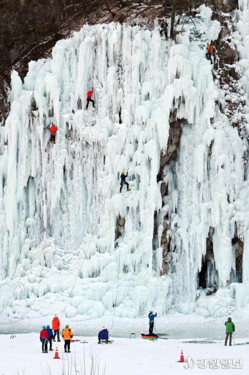아침 최저기온이 영하 13도 안팎으로 떨어지며 최강 한파가 이어진 14일 원주 판대아이스파크에서 클라이머들이 빙벽을 오르며 추위를 정면돌파하고 있다.