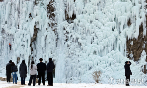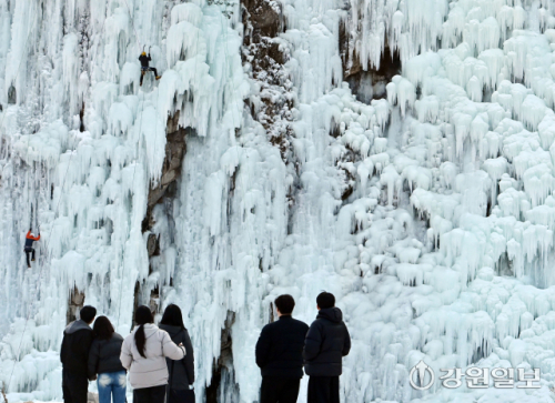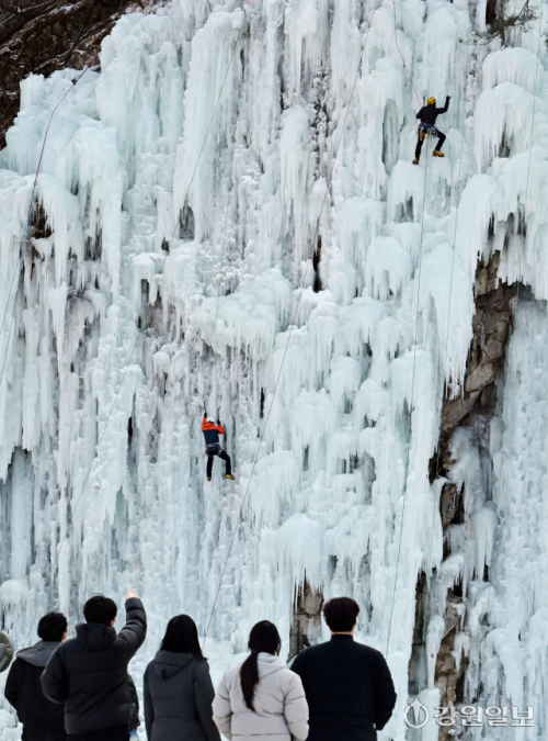 아침 최저기온이 영하 13도 안팎으로 떨어지며 최강 한파가 이어진 14일 원주 판대아이스파크에서 관광객들이 빙벽과 빙벽을 오르는 동호인들을 보고 있다. 신세희기자