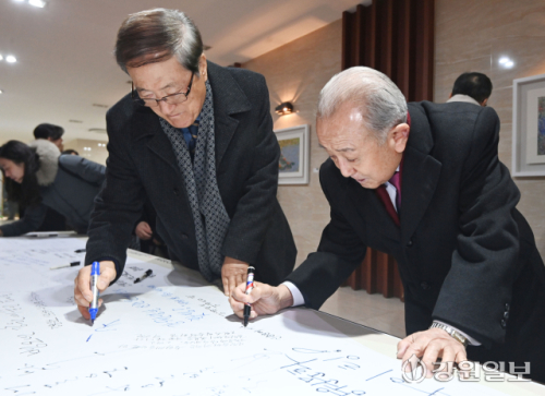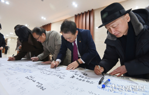 14일 춘천 베어스호텔에서 열린 '2026 강원문화예술인 신년교례회 및 강원일보 신춘문예 시상식'에서는 강원 문화계의 발전을 바탕으로 관광 확대를 희망하는 메시지들이 가득했다. 이날 참석한 기관·단체장들을 비롯해 문화예술인들은 행사장 로비에 마련된 사인벨트(참석자들이 손글씨 메시지를 남기는 대형 배너)에 새해 덕담을 적으며 문화로 꽃 피우는 강원, 관광으로 더욱 빛나는 강원을 염원했다.