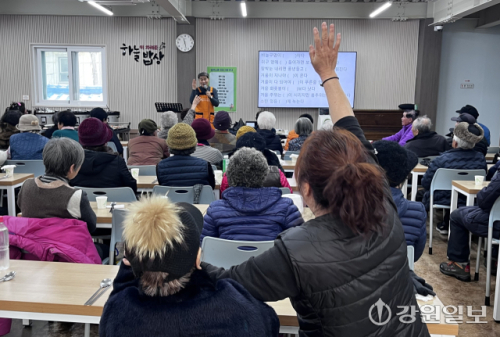 15일 오전에 찾은 춘천의 한 무료급식소, 점심시간이 다가오자 하늘밥상을 찾은 어르신들로 80여석이 금세 꽉 찼다. 이곳 하늘밥상에는 식사 전 진행되는 특별 이벤트가 있다. 어르신들은 날마다 체조·노래·게임 등으로 번갈아 진행되는 프로그램을 손꼽아 기다린다. 퀴즈가 시작되자 분위기는 한껏 고조됐다. 창밖의 추위마저 정답을 외치는 어르신들의 열기를 식히지 못했다. 어르신들은 그렇게 한층 친해진 분위기 속에서 밥을 먹고 안부를 주고받았다.