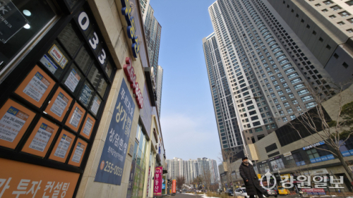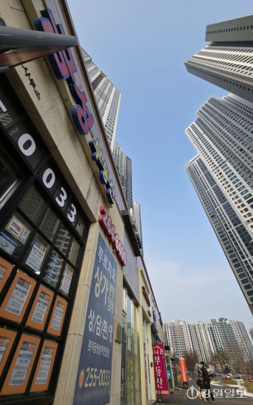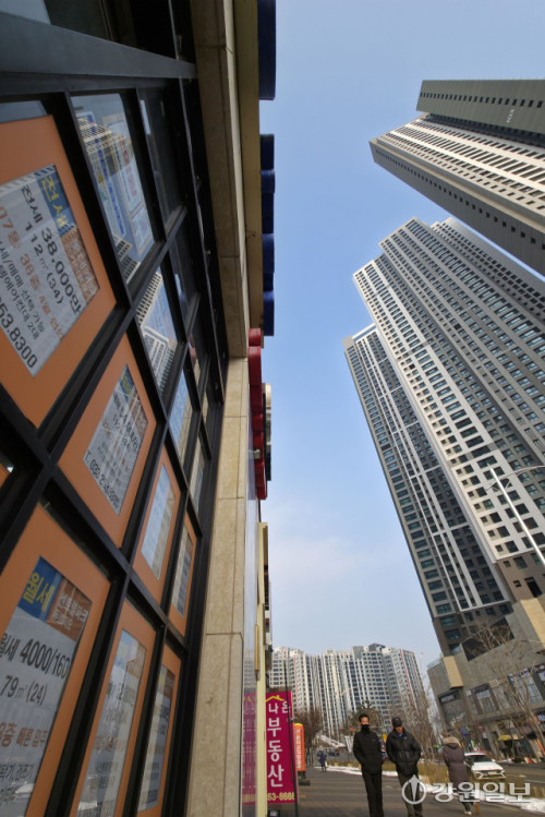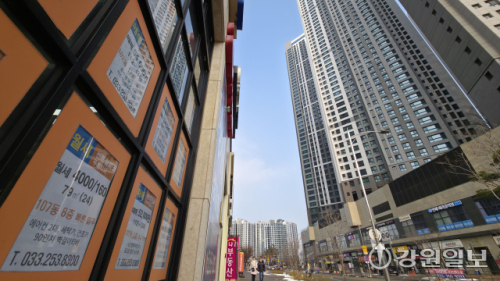 최근 강원지역 각종 부동산 관련 지표가 회복세를 보이면서 부동산 경기회복에 대한 기대감이 오르고 있다. 15일 춘천시 온의동 고층아파트단지 주변 상가에 위치한 부동산 외벽에 주변아파트의 전·월세 및 매매 거래 안내문이 가득 부착돼 있다.