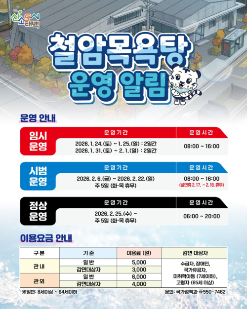 시 관계자는 "임시·시범운영 기간 동안 실제 이용 과정에서 나타나는 불편 사항과 개선 의견을 충분히 반영한 후 정상운영에 들어갈 계획"이라며 "철암목욕탕이 지역 주민들의 건강 증진과 생활 편의를 높이는 대표적인 공공복지시설로 자리매김할 수 있도록 최선을 다하겠다"고 말했다.