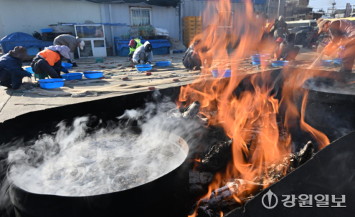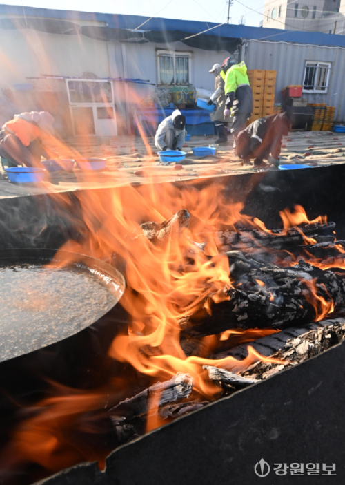 절기상 대한(大寒)을 하루 앞둔 19일 강릉시 주문진항에서 어민들이 모닥불을 피워 놓고 추위에 언 손과 몸을 녹이며 양미리를 그물에서 떼어내는 작업을 하고 있다. 이번 주중 북쪽에서 내려온 찬 공기가 한반도를 덮치면서 아침최저 기온이 -10도 이하로 떨어지는 등 주말까지 한파가 이어질 전망이다.