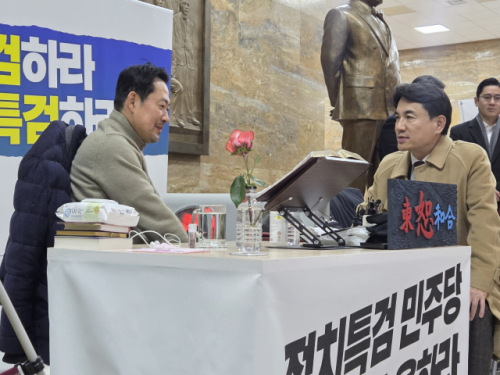 김 지사는 이날 국회 본관 로텐더홀에서 ‘쌍특검’(통일교·공천비리)을 주장하며 단식 농성 중인 장 대표를 만나 손을 맞잡고 격려의 뜻을 전했다.