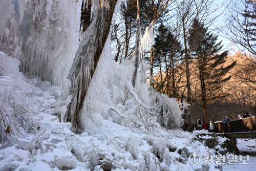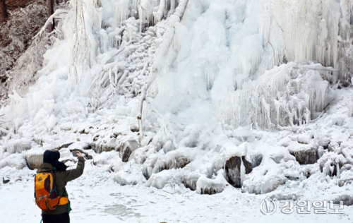 최강 한파가 시작된 20일 춘천 구곡폭포 등산로 입구에서 얼어붙은 고드름이 추위를 실감케 하고 있다.