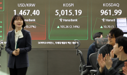 22일 오전 9시 1분 기준 코스피 지수는 장 시작과 함께 전장보다 77.13포인트(1.57%) 오른 4,987.06으로 출발한 뒤, 오전 9시 14분 미국의 유럽에 대한 관세 철회 소식에 빠르게 상승폭을 키우며 5,002.02로 사상 처음 5,000 고지를 돌파했다.