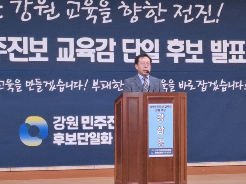 강삼영 '강원민주진보 교육감 후보'는 “4년전 단일화 실패로 인한 신경호 후보의 당선은 참으로 뼈아팠다. 강원교육은 무너지고 후퇴하고 있다. 이제 흔들리는 강원교육을 바로 세우고 새로운 이정표를 만들어야한다. 강삼영이 해내겠다”고 포부를 밝혔다. 이어 "진보의 가치 아래 하나가 되었고 신뢰와 지지의 힘으로 강원도민 모두의 교육감이 되겠다"고 약속했다.