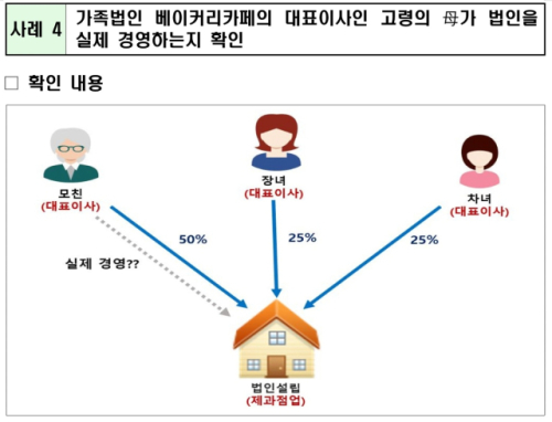 예를 들어 근로·사업 내역이 없는 80대 부모와 자녀 2명이 공동대표이사로 등기하고 베이커리카페를 운영한다고 했을 때, 고령의 부모가 법인을 실제로 경영하는지 확인한다.