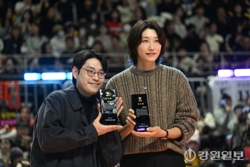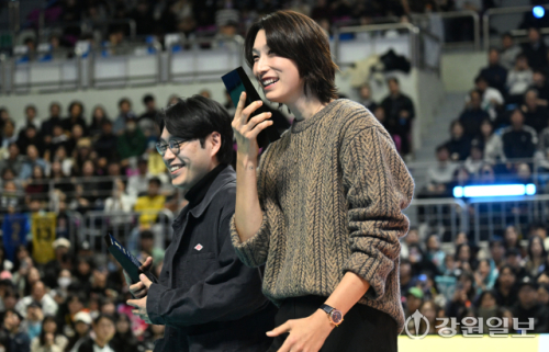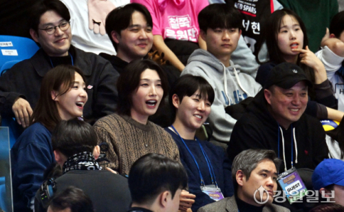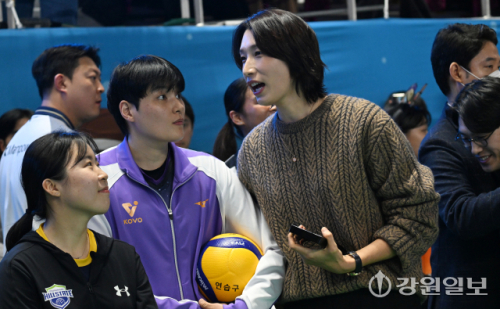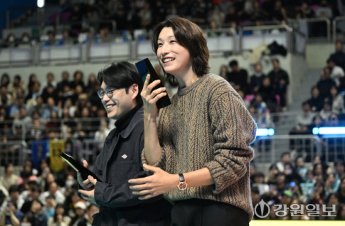 25일 춘천 호반체육관에서 열린 '진에어 2025~2026 V-리그 올스타전' 행사장을 찾은 배구 여제 김연경이 시민들과 함께 경기를 관람하고 있다. 박승선기자