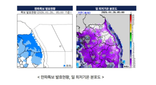 원주, 영월, 홍천평지, 정선평지, 태백에는 한파주의보가 내려졌으며 대부분의 강원 산지에는 한파경보가 발령됐다. 동해안 6개 시군과 산지·정선에는 건조특보가 발표되는 등 화재에 각별한 주의가 필요하다. 26일 낮 최고기온은 영하 3도~영상 6도로 전망됐다.