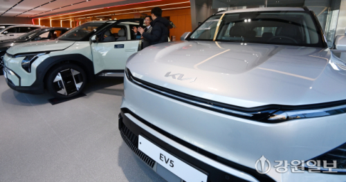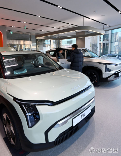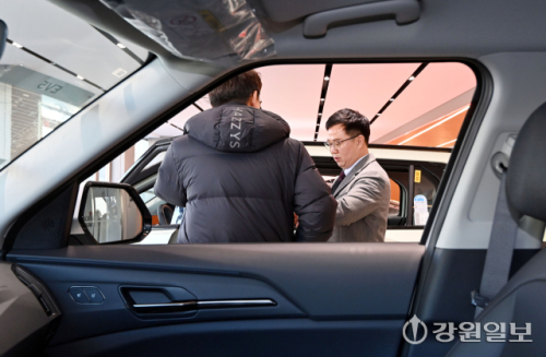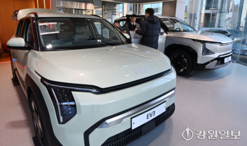 올해 각 지자체들의 전기차 보조금이 발표되면서 고유가 시대를 맞은 시민들이 전기차 구매에 관심을 기울이고 있다. 28일 춘천 온의동 기아 춘천지점에서 한 시민이 전기차 구매를 위해 상담을 받고 있다.