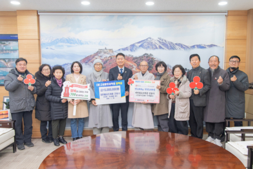 건봉사(주지:설주스님) 신도회·거사림회는 29일 고성군청 군수 집무실에서 쌀 3,000㎏ 및 연탄 3,000장과 고성향토장학회 장학금 1,500만원을 함명준 군수에게 기탁했다.