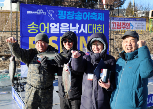평창송어축제 20주년을 기념하는 '평창송어얼음낚시대회' 1차 경기가 29일 평창 오대천 평창송어축제장에서 강원도민을 대상으로 열려 입상자들이 잡은 송어를 들고 기념사진을 촬영하고 있다. 30일에는 전 국민을 대상으로 한 2차 경기가 같은 장소에서 열린다.