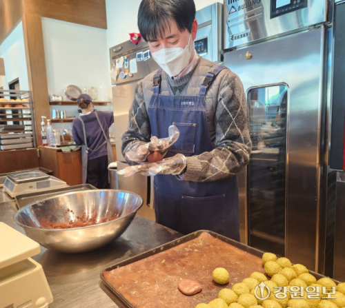 지난 30일 오후 3시, 춘천 신촌리의 한 카페. 점심시간 이후 비교적 한산한 오후 3시부터 6시까지 이곳에서는 매일 두쫀쿠 약 300개를 만든다. 사장을 포함해 직원 5명이 분업해 작업에 나선다.