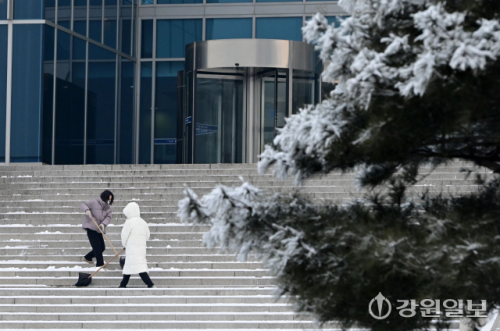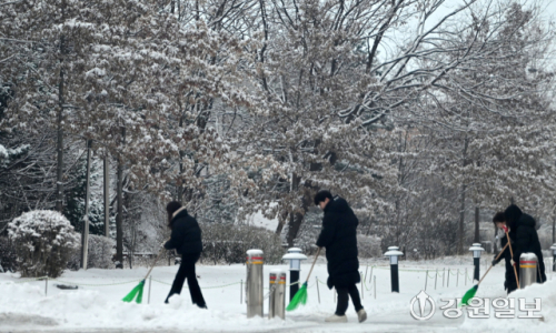 밤새 눈이 내린 2일 한림대에서 학생과 직원들이 쌓인 눈을 치우고 있다.
