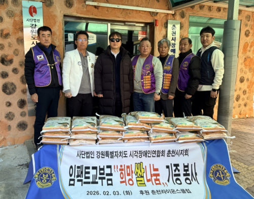 국제라이온스협회 354-E(강원)지구 춘천라이온스클럽(회장:심헌용)은 3일 설 명절을 앞두고 소외된 이웃을 돕기 위해 (사)강원특별자치도시각장애인협회 춘천시지회(회장:반익수)에 쌀 50포대(10kg)를 전달했다.