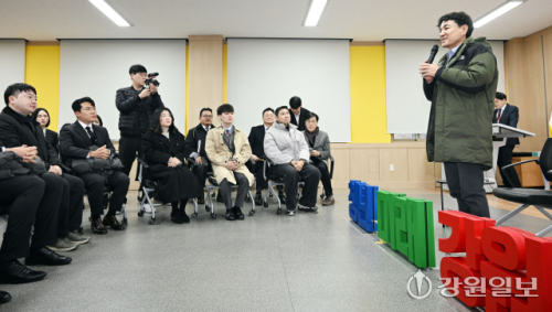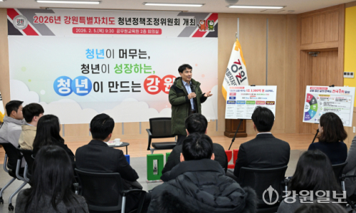 김진태 지사가 5일 강원자치도공무원교육원에서 열린 청년정책 조정위원회에서 '2026~2030 제2차 청년정책 기본계획'을 발표하고 있다.