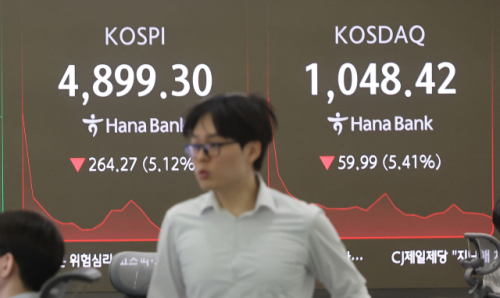 코스피는 이날 오전 9시 25분 현재 전장보다 226.33포인트(4.38%) 떨어진 4,937.24에 거래되고 있다. 전날 3.86% 내린 데 이어 이틀 연속 급락세다.