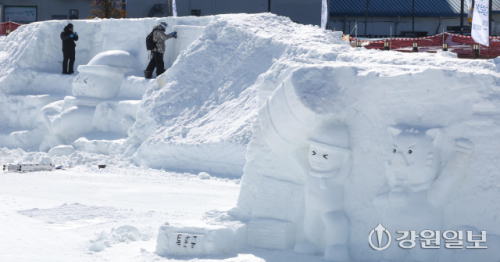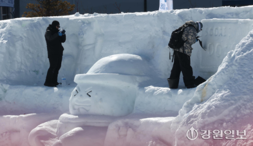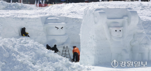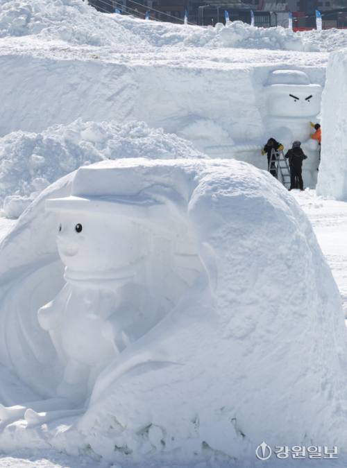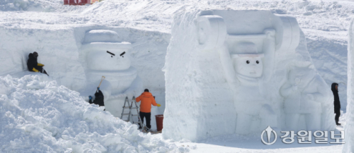 고성 향로봉 아침 기온 영하 23.5도, 화천 광덕산 영하 23.4도, 철원 임남 영하 22.9도, 대관령 영하 18.9도 등 영하 20도 안팎의 강추위가 이어지는 가운데 8일 평창군 대관령면에서 '제34회 대관령 눈꽃축제' 관계자들이 강추위 속에 눈조각을 만드느라 분주하다. 평창=권태명기자