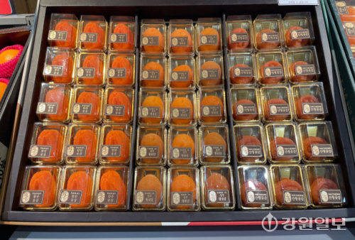 9일 찾은 춘천의 한 대형마트 입구에는 설을 앞두고 명절 선물세트가 진열돼 있었다. 가로 60여㎝, 세로 30여㎝ 크기의 선물 상자에는 플라스틱 용기로 개별 포장된 곶감 45개가 담겨 있었다. 또 고가의 주류 선물세트는 500㎖ 양주 1병에, 술잔 1개를 추가하면서 포장상자 크기를 가로 20여㎝·세로 30여㎝ 수준까지 늘렸다.