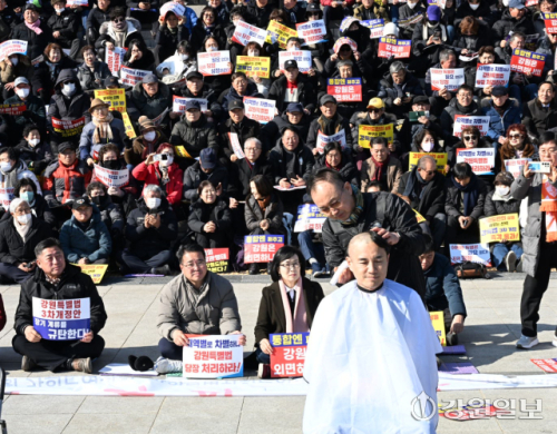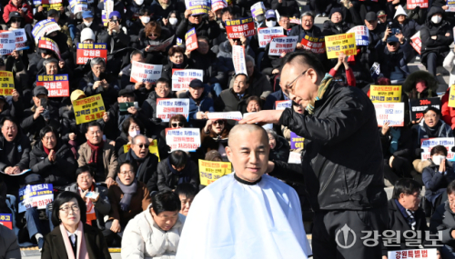김 지사는 이날 국회 본관 앞에서 열린 강원도민 국회 상경 결의대회에 참석, 참석자 가운데 가장 먼저 삭발하고 강원특별법 처리에 대한 목소리를 높였다. 김시성 도의장 등도 삭발에 동참했다.