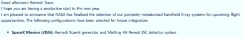 NASA는 전 세계 200개 이상의 제품을 검토한 뒤 2024년 레메디, MinXray(미국), 후지필름(일본) 3사 제품을 최종 후보로 압축했다. 3년 간의 평가를 완료한 후 지난 1월6일 레메디 측에 선정 사실을 공식 통보했다.