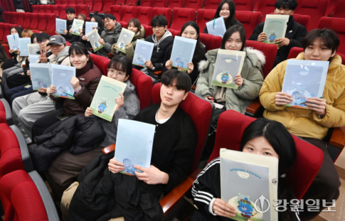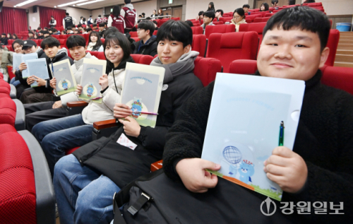 9일 강원대 인문대학 2호관에서 열린 사회과학대학 신입생 오리엔테이션에 참석한 26학번 새내기들이 증정받은 신입생 키트를 들어보이고 있다.