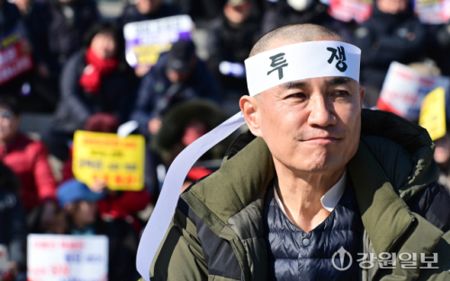 김진태 강원특별자치도지사가 9일 국회에서 열린 강원특별법 3차 개정안 통과 촉구 상경집회에서 삭발과 농성을 감행하며 승부수를 던졌다.