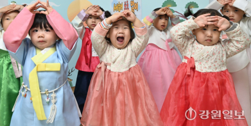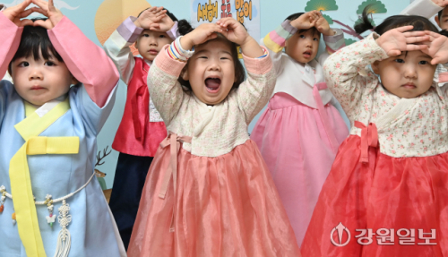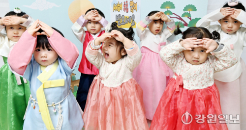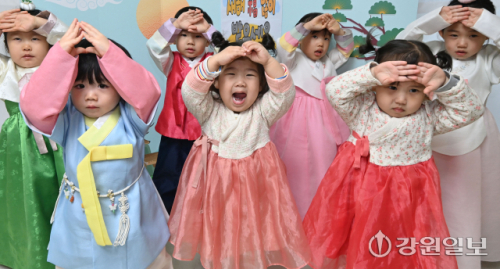 설 명절을 앞둔 12일 춘천시 우두동 동부어린이집에서 한복을 차려입은 어린이들이 세배와 윷놀이를 배우며 명절 문화 체험을 하고 있다. 임도혁기자