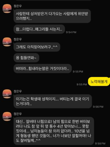 이어 "그래도 아직 믿어보려고"라면서 "힘들면 와, 버텨라, 힘내라는 말은 거짓이더라"고 적었다.