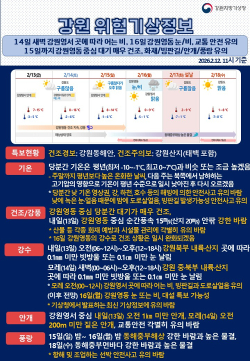 강원지방기상청이 발표한 설 연휴 기상 전망에 따르면 연휴 초반인 13~14일 영서지역은 짙은 안개가 발생하면서 이슬비가 내리겠고 영동지역은 맑은 날씨를 보이겠지만 강풍이 지속되는 가운데 대기가 매우 건조하겠다.