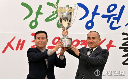이어 방정기 사무처장이 김진태 회장에게 우승 트로피와 우승기를 전달했다.