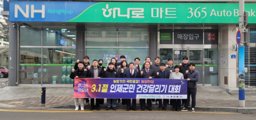 인제농협 정성빈조합장과 임직원들은 18일 농협하나로마트 앞에서 오는 3월1일 열리는 인제군민 건강달리기대회에 참가하고 농업가치 국민공감 농심천심 운동에 앞장설 것을 다짐하며 파이팅을 외쳤다.