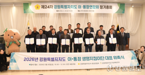 2026년 강원특별자치도 이·통장연합회 정기총회가 20일 춘천 세종호텔에서 전영록 연합회장을 비롯한 시·군 연합회장 등이 참석한 가운데 열렸다. 이·통장 생명지킴이단에 위촉된 이·통장들이 함께 기념촬영을 하고 있다. 박승선기자