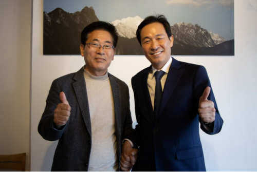 ◇6.3 지방선거 화천군수 출마를 준비중인 더불어민주당 최수명 전 화천부군수(사진 왼쪽)와 도지사 출마를 선언한 우상호 전 청와대 정무수석이 지난 19일 춘천의 한 카페에서 만나 정책 간담회를 가졌다. 사진=최수명 전 화천 부군수 제공.