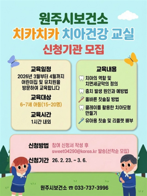 【원주】원주시보건소는 23일부터 다음달 6일까지 어린이 치아건강교실 프로그램에 참여할 유치원과 어린이집을 모집한다.