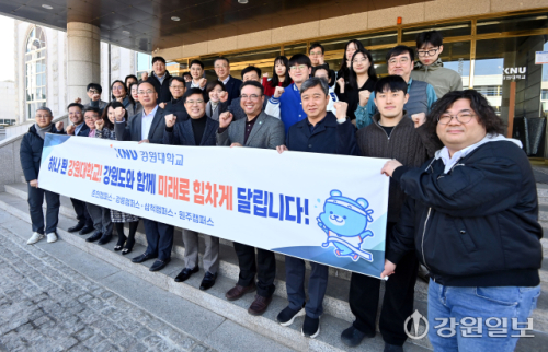 정재연 강원대 총장과 직원들이 23일 대학본부 앞에서 3·1절 기념 시민건강달리기대회 참가 및 완주를 다짐하고 있다. 임도혁기자