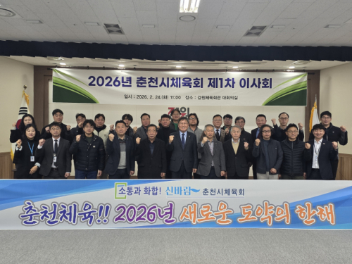춘천시체육회는 24일 강원체육회관 대회의실에서 제1차 이사회를 개최했다. 이날 회의에는 이강균 춘천시체육회장을 비롯한 회장단, 이사, 감사 등 임원 52명이 참석해 2025년 제4차 이사회 결과를 비롯한체육진흥협의회 운영 결과, 민선 2기 공약 이행 현황, 임원 변동 사항, 종합체육대회 일정 등을 보고받았다. 이어 이사 보선 승인과 2026년 정기 대의원총회에 상정할 안건을 심의·의결했다.