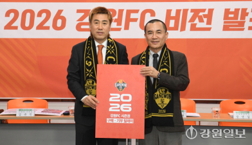 한편 이날 비전 발표에 앞서 도와 강원FC는 소외계층 아동을 위한 ‘2026시즌 시즌권 구매·기부 릴레이’를 진행했다. 행사에서 구매된 시즌권은 사회복지협의회를 통해 도내 복지시설 아동들에게 전달될 예정이다.