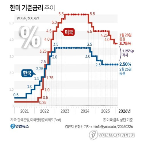 한국은행 금융통화위원회는 26일 통화정책방향 회의를 열고 기준금리를 연 2.50%로 유지하기로 의결했다. 금통위는 지난해 5월 기준금리를 연 2.75%에서 0.25%포인트 인하한 이후 7·8·10·11월에 이어 올해 1·2월까지 여섯 차례 연속 금리를 동결했다.