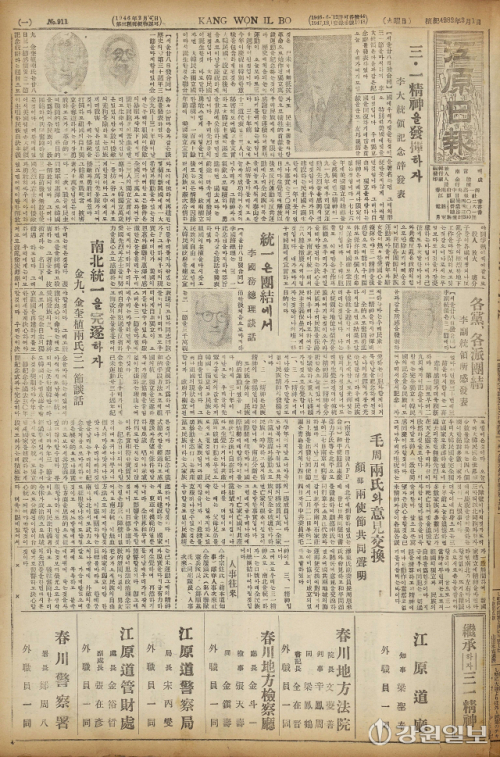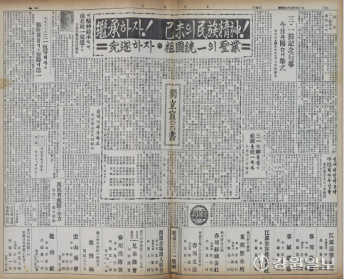 1919년 민족의 운명을 뒤흔든 이 한 문장은 대한민국 정부 수립 이듬해인 1949년 3월 1일, 다시 한 번 활자로 되살아났다. 정부 수립 후 처음 맞은 3·1절을 앞두고, 독립운동조직인 ‘문화동지회’가 1945년 창간한 강원일보는 지역언론으로는 처음으로 3·1운동 30주년 특집 지면에 ‘기미독립선언서’ 전문을 통째로 실어, 새 나라의 뿌리가 3·1정신 위에 놓여 있음을 분명히 했다.